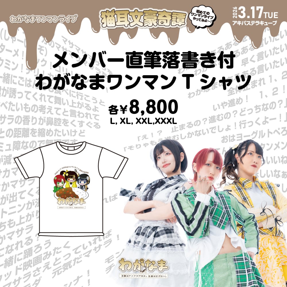 わがなま初ワンマン「わがなまワンマンライブ 猫耳文豪奇譚 第一章」のメンバー落書き入りワンマンTシャツです。